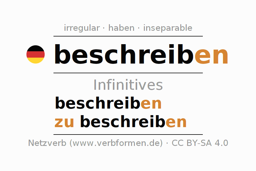 The infinitives of beschreiben (describe, depict) are: beschreiben, zu beschreiben. The ending -en is appended to the verb stem schreib. When forming the infinitive with zu, the "zu" is prepended to the verb, since it has no separable first parts. The formation of the forms corresponds to the grammatical rules for the conjugation of verbs in the infinitive. 1Comment ☆5.0