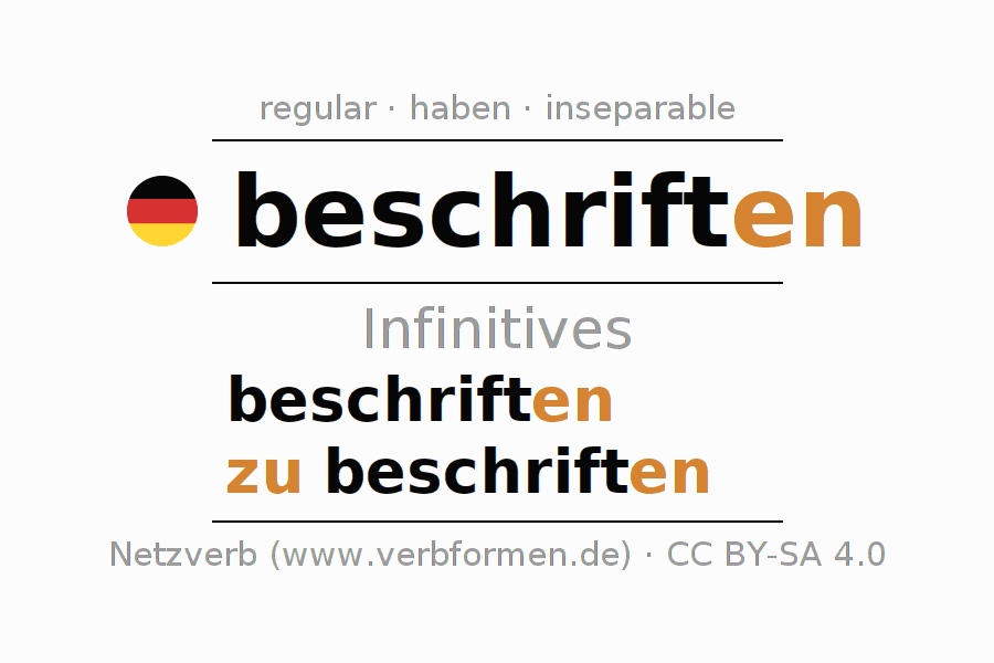 The infinitives of beschriften (label, inscribe) are: beschriften, zu beschriften. The ending -en is appended to the verb stem schrift. When forming the infinitive with zu, the "zu" is prepended to the verb, since it has no separable first parts. The formation of the forms corresponds to the grammatical rules for the conjugation of verbs in the infinitive. Comments ☆