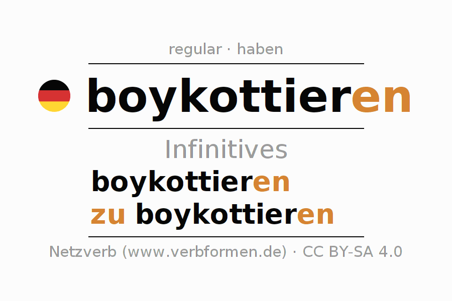 The infinitives of boykottieren (boycott) are: boykottieren, zu boykottieren. The ending -en is appended to the verb stem boykottier. When forming the infinitive with zu, the "zu" is prepended to the verb, since it has no separable first parts. The formation of the forms corresponds to the grammatical rules for the conjugation of verbs in the infinitive. Comments ☆