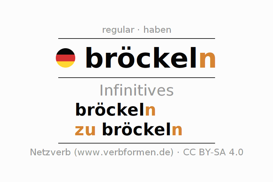 The infinitives of bröckeln (crumble, break apart) are: bröckeln, zu bröckeln. The ending -n, shortened by an "e", is appended to the verb stem bröckel, since the stem ends with -el. When forming the infinitive with zu, the "zu" is prepended to the verb, since it has no separable first parts. The formation of the forms corresponds to the grammatical rules for the conjugation of verbs in the infinitive. Comments ☆