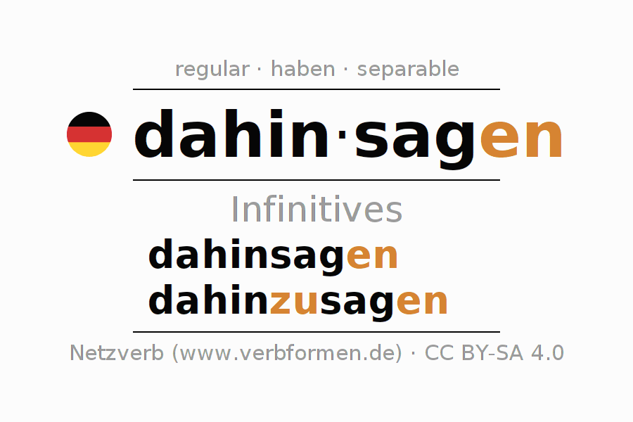 The infinitives of dahinsagen (speak carelessly, speak thoughtlessly) are: dahinsagen, dahinzusagen. The ending -en is appended to the verb stem sag. When forming the infinitive with zu the "zu" is inserted after the separable first part dahin-. The formation of the forms corresponds to the grammatical rules for the conjugation of verbs in the infinitive. Comments ☆