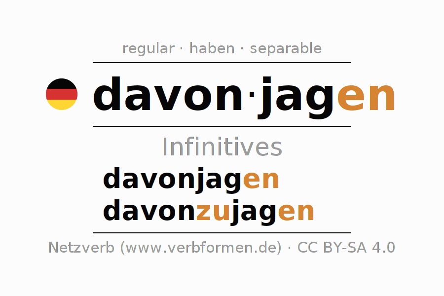 The infinitives of davonjagen (chase away, chase off) are: davonjagen, davonzujagen. The ending -en is appended to the verb stem jag. When forming the infinitive with zu the "zu" is inserted after the separable first part davon-. The formation of the forms corresponds to the grammatical rules for the conjugation of verbs in the infinitive. Comments ☆