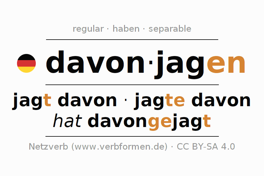 The verb davonjagen fully conjugated in all persons and numbers in the Infinitive Present Perfect