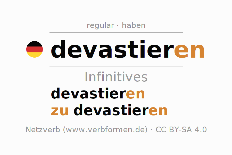 The infinitives of devastieren (devastate, destroy) are: devastieren, zu devastieren. The ending -en is appended to the verb stem devastier. When forming the infinitive with zu, the "zu" is prepended to the verb, since it has no separable first parts. The formation of the forms corresponds to the grammatical rules for the conjugation of verbs in the infinitive. Comments ☆