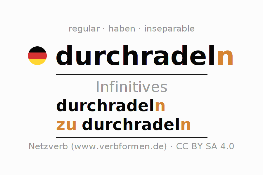 The infinitives of durchradeln (cycle through, bicycle through) are: durchradeln, zu durchradeln. The ending -n, shortened by an "e", is appended to the verb stem radel, since the stem ends with -el. When forming the infinitive with zu, the "zu" is prepended to the verb, since it has no separable first parts. The formation of the forms corresponds to the grammatical rules for the conjugation of verbs in the infinitive. Comments ☆