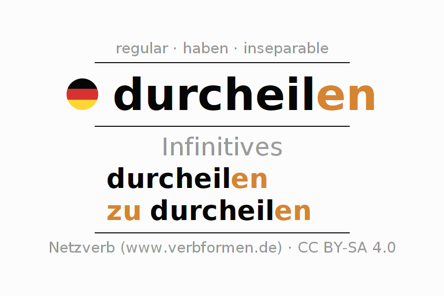The infinitives of durcheilen (rush through, hurry through) are: durcheilen, zu durcheilen. The ending -en is appended to the verb stem eil. When forming the infinitive with zu, the "zu" is prepended to the verb, since it has no separable first parts. The formation of the forms corresponds to the grammatical rules for the conjugation of verbs in the infinitive. Comments ☆