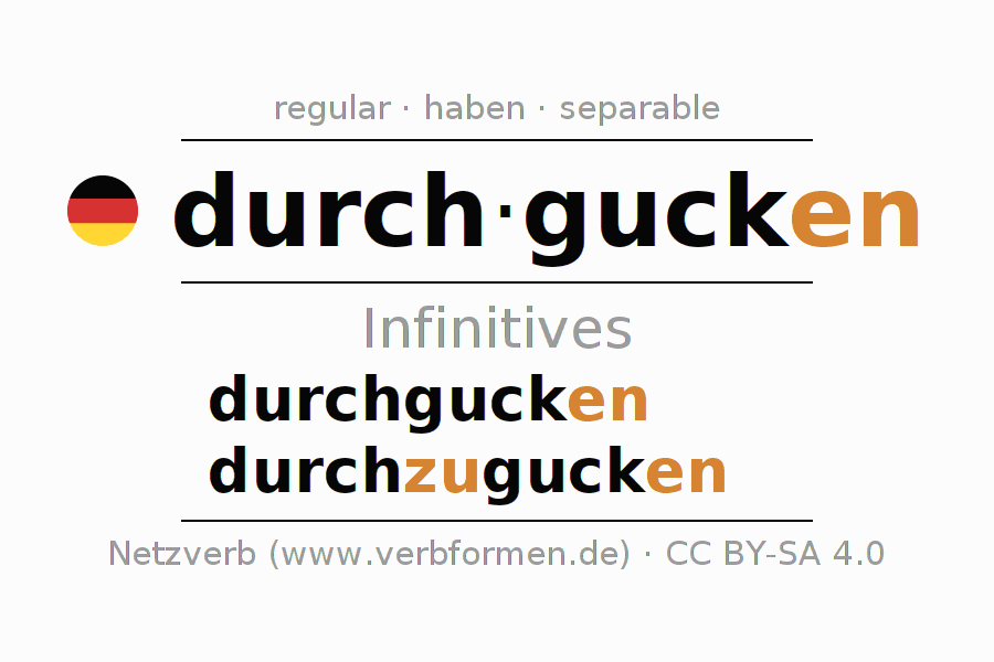 The infinitives of durchgucken (look through, see through) are: durchgucken, durchzugucken. The ending -en is appended to the verb stem guck. When forming the infinitive with zu the "zu" is inserted after the separable first part durch-. The formation of the forms corresponds to the grammatical rules for the conjugation of verbs in the infinitive. Comments ☆