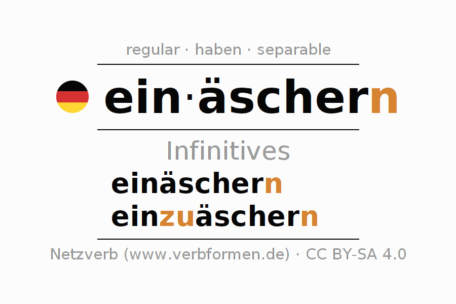 The infinitives of einäschern (cremate, incinerate) are: einäschern, einzuäschern. The ending -n, shortened by an "e", is appended to the verb stem äscher, since the stem ends with -er. When forming the infinitive with zu the "zu" is inserted after the separable first part ein-. The formation of the forms corresponds to the grammatical rules for the conjugation of verbs in the infinitive. Comments ☆