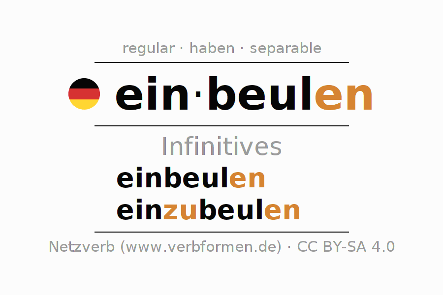 The infinitives of einbeulen (dent, become dented) are: einbeulen, einzubeulen. The ending -en is appended to the verb stem beul. When forming the infinitive with zu the "zu" is inserted after the separable first part ein-. The formation of the forms corresponds to the grammatical rules for the conjugation of verbs in the infinitive. Comments ☆