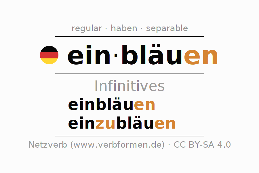 The infinitives of einbläuen (instill, impress) are: einbläu(e)n, einzubläu(e)n. The ending -en is appended to the verb stem bläu. When forming the infinitive with zu the "zu" is inserted after the separable first part ein-. The formation of the forms corresponds to the grammatical rules for the conjugation of verbs in the infinitive. Comments ☆