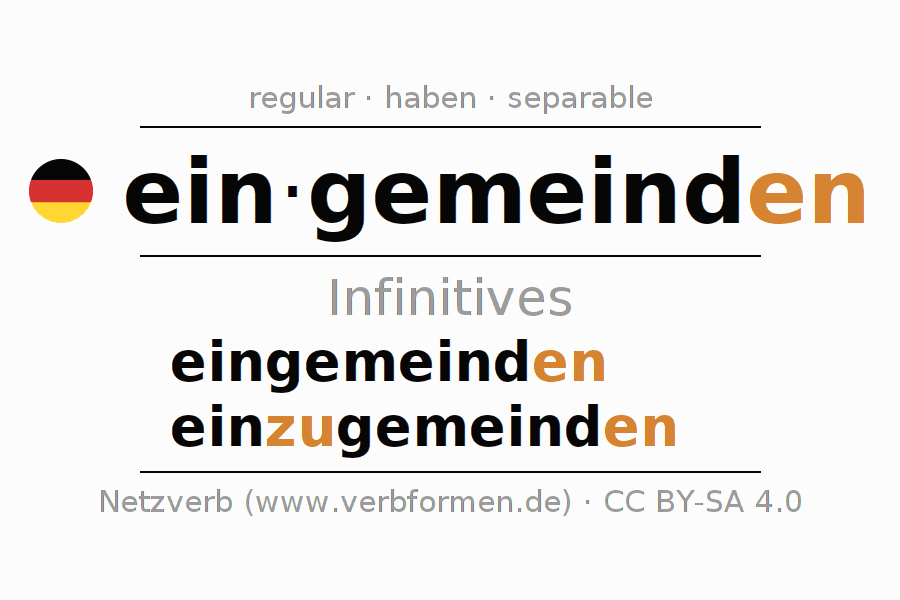 The infinitives of eingemeinden (suburbanize, incorporate) are: eingemeinden, einzugemeinden. The ending -en is appended to the verb stem meind. When forming the infinitive with zu the "zu" is inserted after the separable first part ein-. The formation of the forms corresponds to the grammatical rules for the conjugation of verbs in the infinitive. Comments ☆