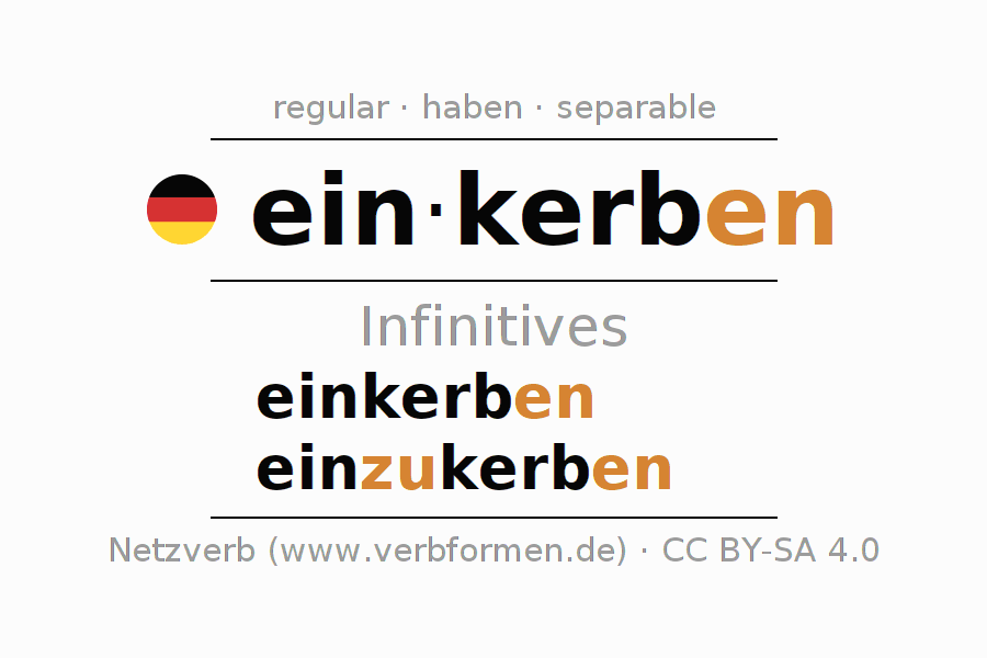 The infinitives of einkerben (groove, indentation) are: einkerben, einzukerben. The ending -en is appended to the verb stem kerb. When forming the infinitive with zu the "zu" is inserted after the separable first part ein-. The formation of the forms corresponds to the grammatical rules for the conjugation of verbs in the infinitive. Comments ☆