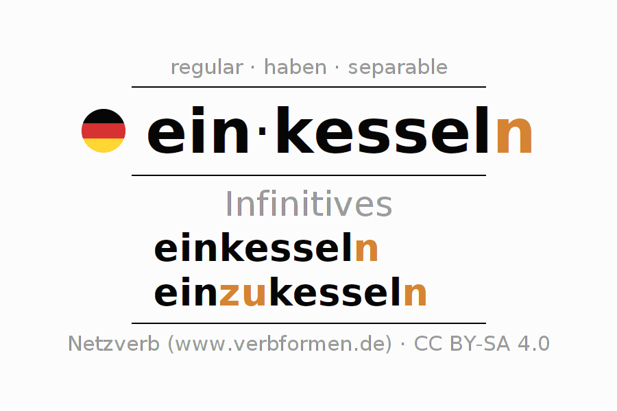The infinitives of einkesseln (surround, encircle) are: einkesseln, einzukesseln. The ending -n, shortened by an "e", is appended to the verb stem kessel, since the stem ends with -el. When forming the infinitive with zu the "zu" is inserted after the separable first part ein-. The formation of the forms corresponds to the grammatical rules for the conjugation of verbs in the infinitive. Comments ☆