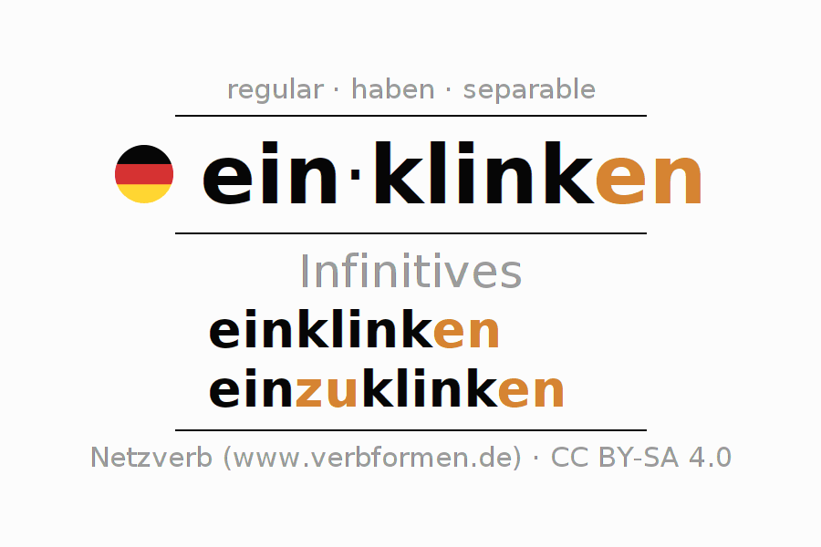 The infinitives of einklinken (engage, click) are: einklinken, einzuklinken. The ending -en is appended to the verb stem klink. When forming the infinitive with zu the "zu" is inserted after the separable first part ein-. The formation of the forms corresponds to the grammatical rules for the conjugation of verbs in the infinitive. Comments ☆