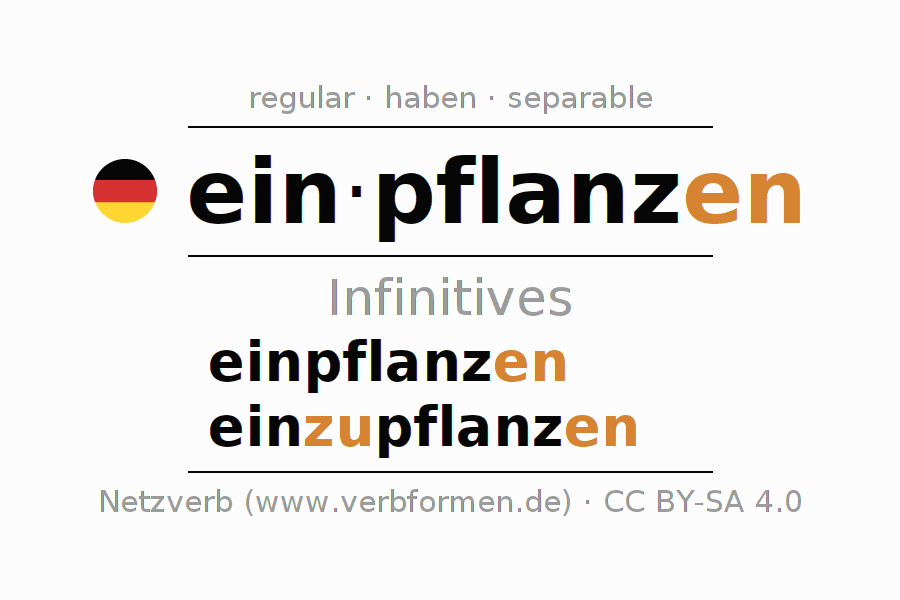 The infinitives of einpflanzen (plant, engraft) are: einpflanzen, einzupflanzen. The ending -en is appended to the verb stem pflanz. When forming the infinitive with zu the "zu" is inserted after the separable first part ein-. The formation of the forms corresponds to the grammatical rules for the conjugation of verbs in the infinitive. Comments ☆