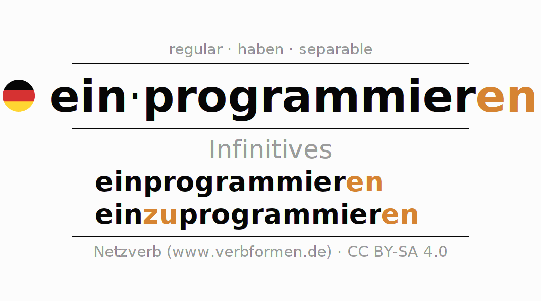 The infinitives of einprogrammieren (program, input program) are: einprogrammieren, einzuprogrammieren. The ending -en is appended to the verb stem programmier. When forming the infinitive with zu the "zu" is inserted after the separable first part ein-. The formation of the forms corresponds to the grammatical rules for the conjugation of verbs in the infinitive. Comments ☆