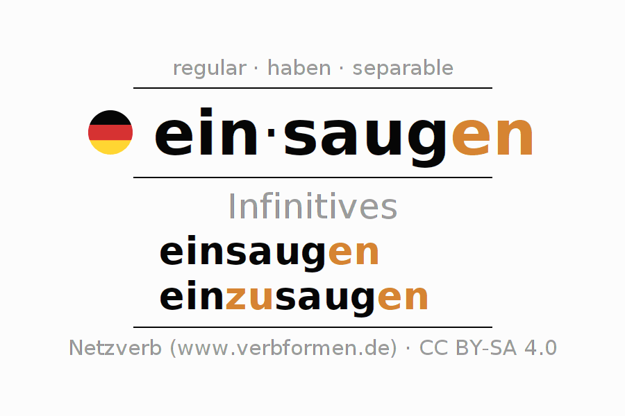 The infinitives of einsaugen (absorb, suck in) are: einsaugen, einzusaugen. The ending -en is appended to the verb stem saug. When forming the infinitive with zu the "zu" is inserted after the separable first part ein-. The formation of the forms corresponds to the grammatical rules for the conjugation of verbs in the infinitive. Comments ☆