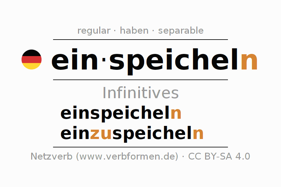The infinitives of einspeicheln (insalivate, mix with saliva) are: einspeicheln, einzuspeicheln. The ending -n, shortened by an "e", is appended to the verb stem speichel, since the stem ends with -el. When forming the infinitive with zu the "zu" is inserted after the separable first part ein-. The formation of the forms corresponds to the grammatical rules for the conjugation of verbs in the infinitive. Comments ☆