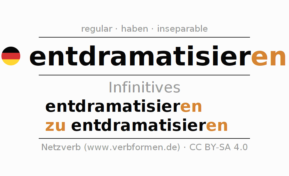 The infinitives of entdramatisieren (de-dramatize, calm down) are: entdramatisieren, zu entdramatisieren. The ending -en is appended to the verb stem dramatisier. When forming the infinitive with zu, the "zu" is prepended to the verb, since it has no separable first parts. The formation of the forms corresponds to the grammatical rules for the conjugation of verbs in the infinitive. Comments ☆