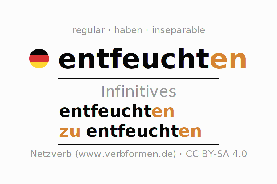 The infinitives of entfeuchten (dehumidify, demist) are: entfeuchten, zu entfeuchten. The ending -en is appended to the verb stem feucht. When forming the infinitive with zu, the "zu" is prepended to the verb, since it has no separable first parts. The formation of the forms corresponds to the grammatical rules for the conjugation of verbs in the infinitive. Comments ☆