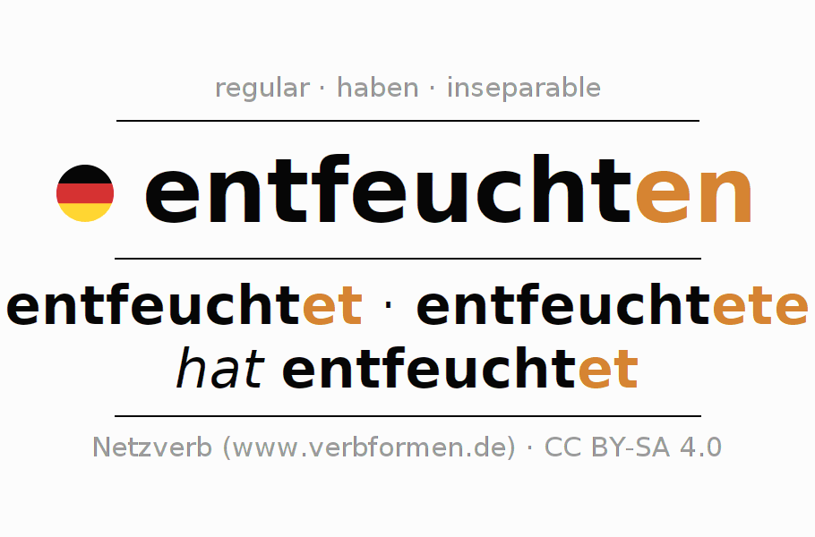 The verb entfeuchten fully conjugated in all persons and numbers in the Infinitive Present Perfect