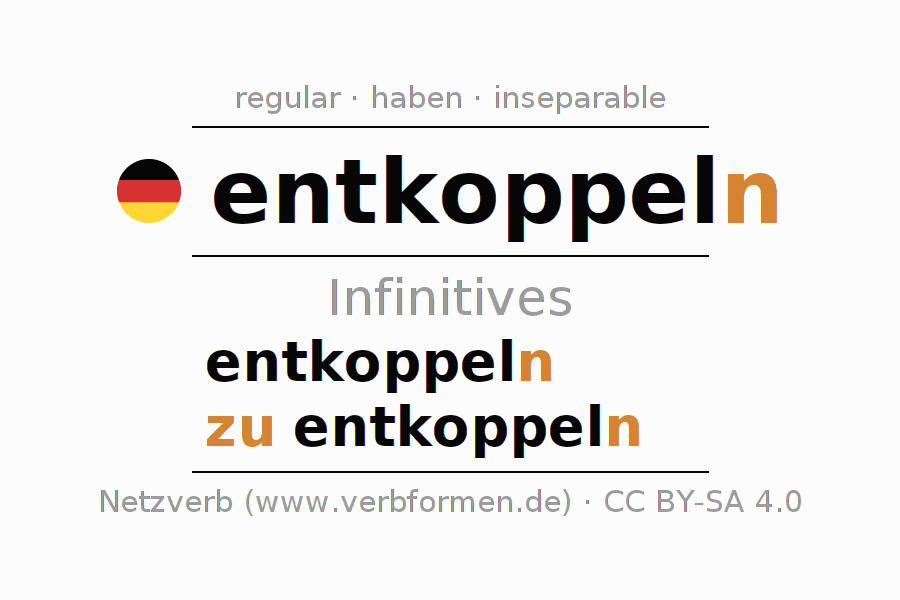 The infinitives of entkoppeln (decouple, uncouple) are: entkoppeln, zu entkoppeln. The ending -n, shortened by an "e", is appended to the verb stem koppel, since the stem ends with -el. When forming the infinitive with zu, the "zu" is prepended to the verb, since it has no separable first parts. The formation of the forms corresponds to the grammatical rules for the conjugation of verbs in the infinitive. Comments ☆