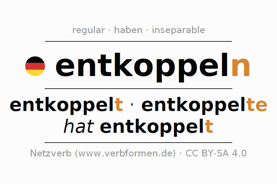 The verb entkoppeln fully conjugated in all persons and numbers in the Infinitive Present Perfect
