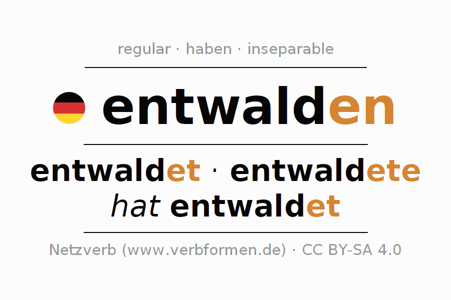 The infinitives of entwalden (deforest) are: entwalden, zu entwalden. The ending -en is appended to the verb stem wald. When forming the infinitive with zu, the "zu" is prepended to the verb, since it has no separable first parts. The formation of the forms corresponds to the grammatical rules for the conjugation of verbs in the infinitive. Comments ☆