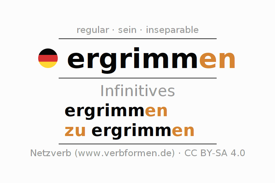 The infinitives of ergrimmen (become angry, become furious) are: ergrimmen, zu ergrimmen. The ending -en is appended to the verb stem grimm. When forming the infinitive with zu, the "zu" is prepended to the verb, since it has no separable first parts. The formation of the forms corresponds to the grammatical rules for the conjugation of verbs in the infinitive. Comments ☆