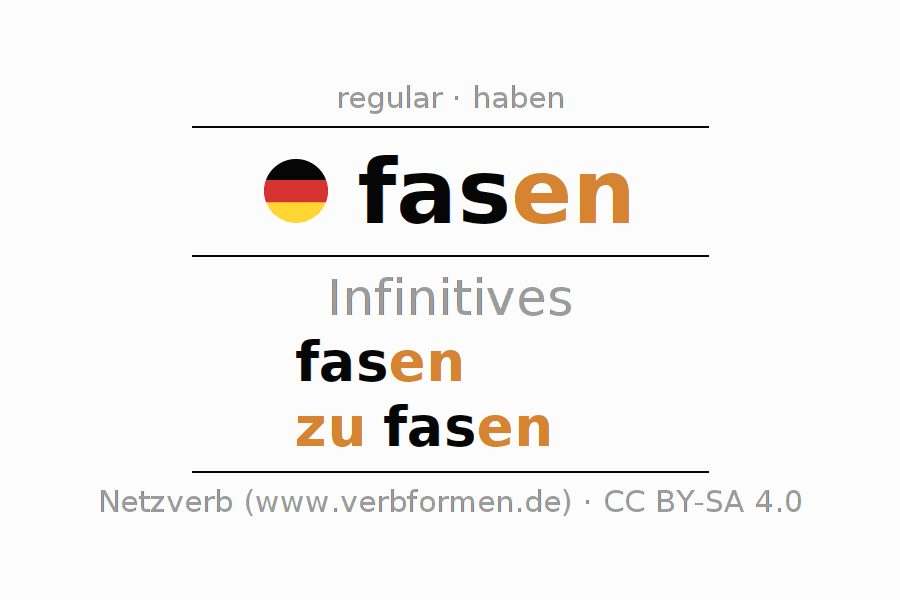 The infinitives of fasen (bevel, attach) are: fasen, zu fasen. The ending -en is appended to the verb stem fas. When forming the infinitive with zu, the "zu" is prepended to the verb, since it has no separable first parts. The formation of the forms corresponds to the grammatical rules for the conjugation of verbs in the infinitive. Comments ☆
