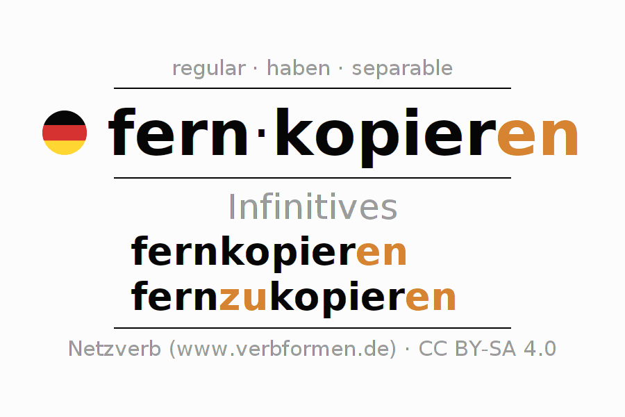 The infinitives of fernkopieren (fax, telecopy) are: fernkopieren, fernzukopieren. The ending -en is appended to the verb stem kopier. When forming the infinitive with zu the "zu" is inserted after the separable first part fern-. The formation of the forms corresponds to the grammatical rules for the conjugation of verbs in the infinitive. Comments ☆