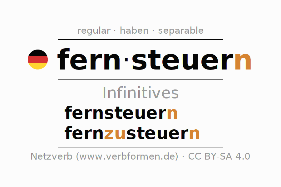 The infinitives of fernsteuern (control remotely, remote control) are: fernsteuern, fernzusteuern. The ending -n, shortened by an "e", is appended to the verb stem steuer, since the stem ends with -er. When forming the infinitive with zu the "zu" is inserted after the separable first part fern-. The formation of the forms corresponds to the grammatical rules for the conjugation of verbs in the infinitive. Comments ☆