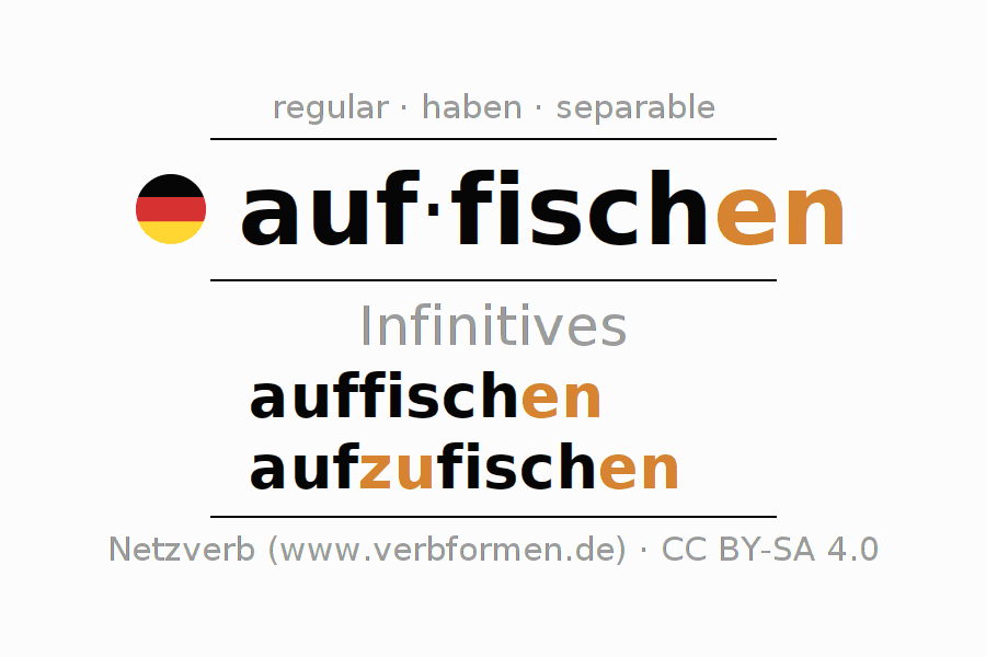 The verb auffischen fully conjugated in all persons and numbers in the Infinitive Present Perfect