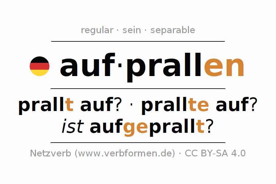 The conjugation of aufprallen in Infinitive Present Perfect base form Active is aufprallen, aufzuprallen.The conjugation corresponds to certain grammatical rules. Likewise the requirements for the conjugation of the simple verb forms of aufprallen in Infinitive. Comments ☆