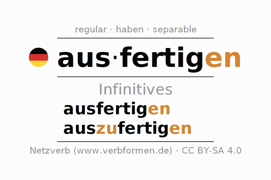 The conjugation of ausfertigen in Infinitive Present Perfect base form Active is ausfertigen, auszufertigen.The conjugation corresponds to certain grammatical rules. Likewise the requirements for the conjugation of the simple verb forms of ausfertigen in Infinitive. Comments ☆