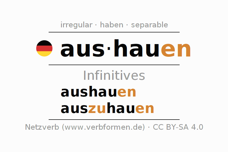 The conjugation of aushauen in Infinitive Present Perfect base form Active is aushau(e)n, auszuhau(e)n.The conjugation corresponds to certain grammatical rules. Likewise the requirements for the conjugation of the simple verb forms of aushauen in Infinitive. Comments ☆