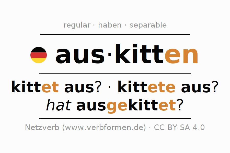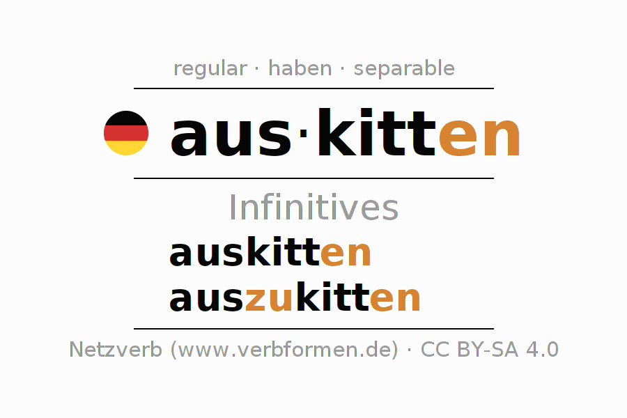 The conjugation of auskitten in Infinitive Present Perfect base form Active is auskitten, auszukitten.The conjugation corresponds to certain grammatical rules. Likewise the requirements for the conjugation of the simple verb forms of auskitten in Infinitive. Comments ☆