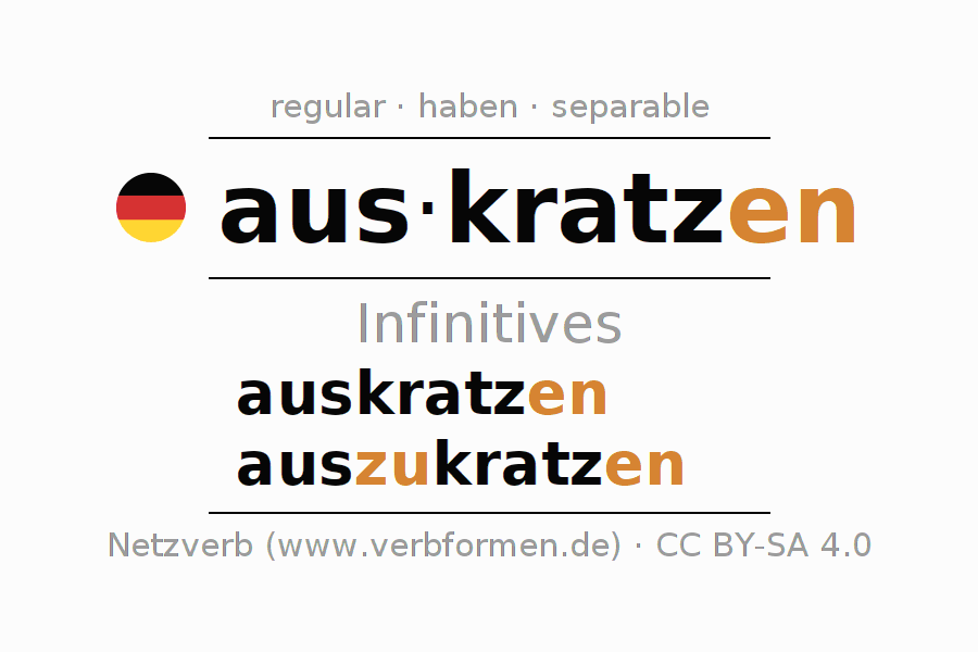 The conjugation of auskratzen in Infinitive Present Perfect base form Active is auskratzen, auszukratzen.The conjugation corresponds to certain grammatical rules. Likewise the requirements for the conjugation of the simple verb forms of auskratzen in Infinitive. Comments ☆