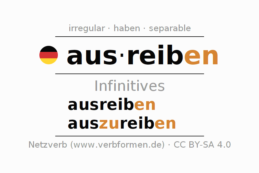 The conjugation of ausreiben in Infinitive Present Perfect base form Active is ausreiben, auszureiben.The conjugation corresponds to certain grammatical rules. Likewise the requirements for the conjugation of the simple verb forms of ausreiben in Infinitive. Comments ☆