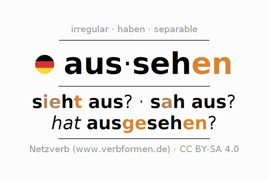 The conjugation of aussehen in Infinitive Present Perfect base form Active is ausseh(e)n, auszuseh(e)n.The conjugation corresponds to certain grammatical rules. Likewise the requirements for the conjugation of the simple verb forms of aussehen in Infinitive. Comments ☆