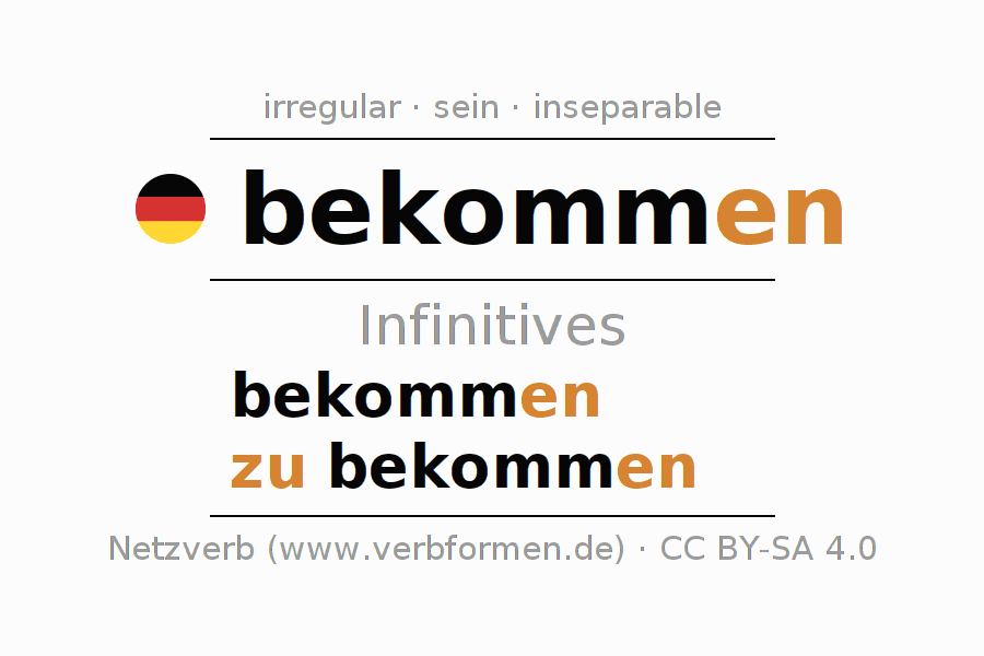 The conjugation of bekommen in Infinitive Present Perfect base form Active is bekommen, zu bekommen.The conjugation corresponds to certain grammatical rules. Likewise the requirements for the conjugation of the simple verb forms of bekommen in Infinitive. 1Comment ☆5.0