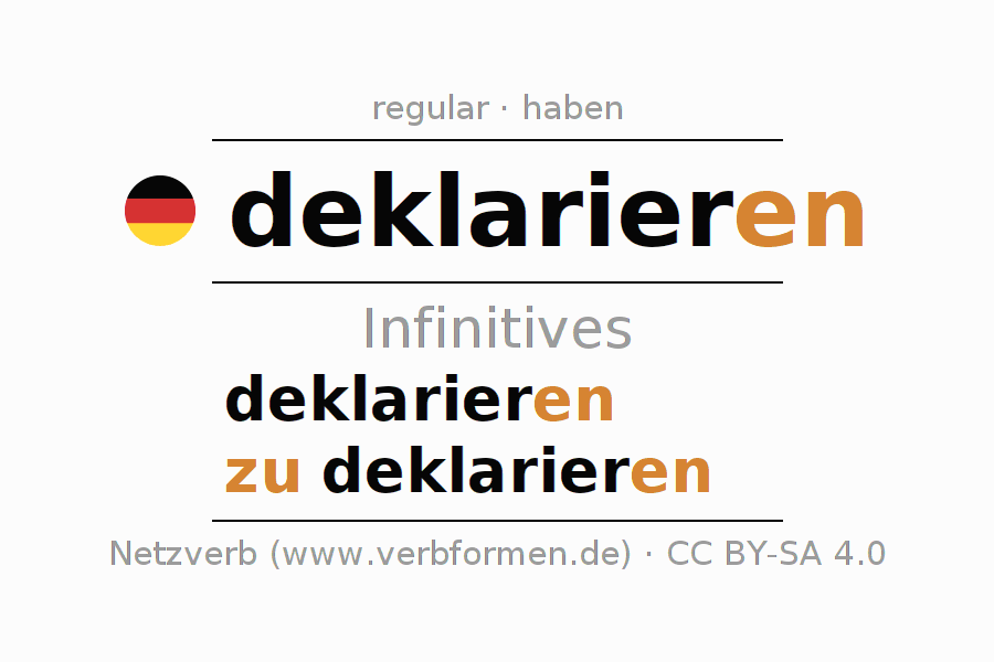 The conjugation of deklarieren in Infinitive Present Perfect base form Active is deklarieren, zu deklarieren.The conjugation corresponds to certain grammatical rules. Likewise the requirements for the conjugation of the simple verb forms of deklarieren in Infinitive. Comments ☆