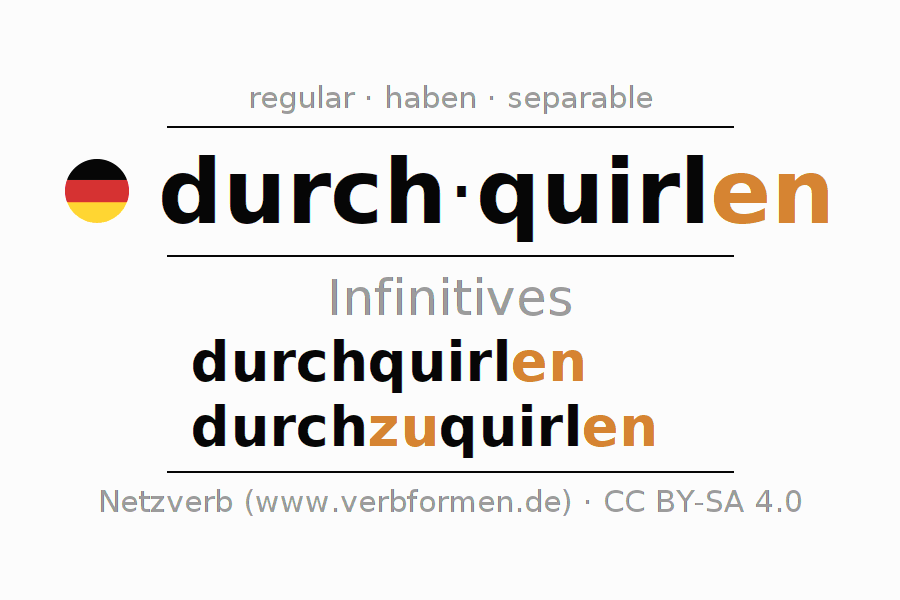 The conjugation of durchquirlen in Infinitive Present Perfect base form Active is durchquirlen, durchzuquirlen.The conjugation corresponds to certain grammatical rules. Likewise the requirements for the conjugation of the simple verb forms of durchquirlen in Infinitive. Comments ☆