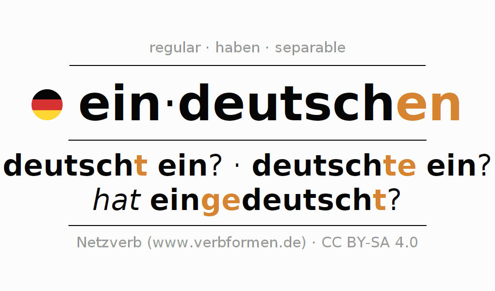 The conjugation of eindeutschen in Infinitive Present Perfect base form Active is eindeutschen, einzudeutschen.The conjugation corresponds to certain grammatical rules. Likewise the requirements for the conjugation of the simple verb forms of eindeutschen in Infinitive. Comments ☆