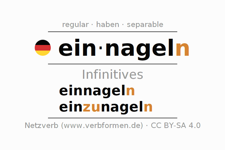 The conjugation of einnageln in Infinitive Present Perfect base form Active is einnageln, einzunageln.The conjugation corresponds to certain grammatical rules. Likewise the requirements for the conjugation of the simple verb forms of einnageln in Infinitive. Comments ☆