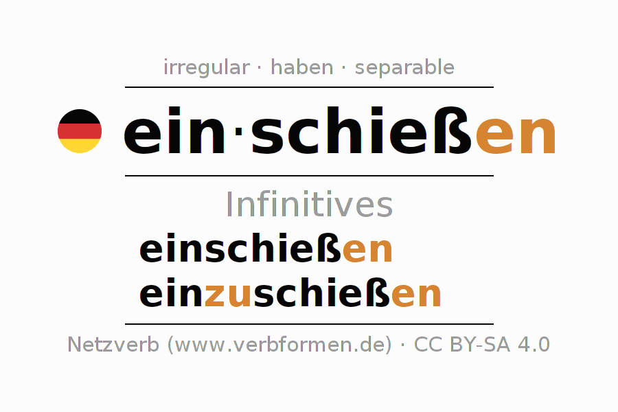 The verb einschießen (hat) fully conjugated in all persons and numbers in the Infinitive Present Perfect