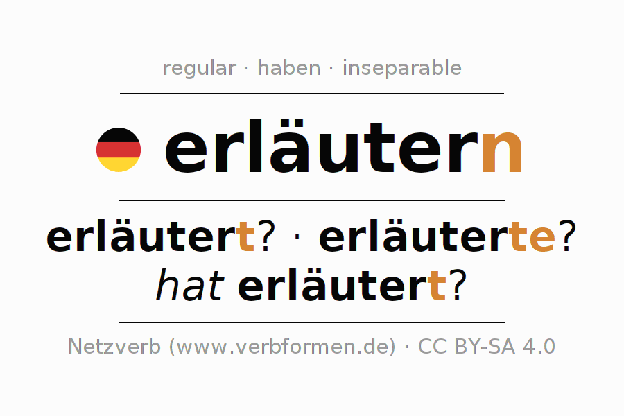 The conjugation of erläutern in Infinitive Present Perfect base form Active is erläutern, zu erläutern.The conjugation corresponds to certain grammatical rules. Likewise the requirements for the conjugation of the simple verb forms of erläutern in Infinitive. Comments ☆