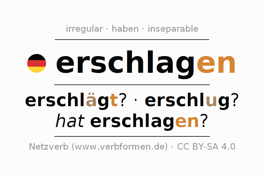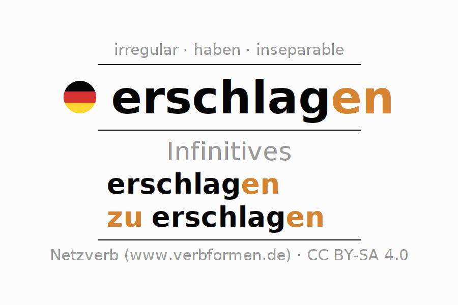 The conjugation of erschlagen in Infinitive Present Perfect base form Active is erschlagen, zu erschlagen.The conjugation corresponds to certain grammatical rules. Likewise the requirements for the conjugation of the simple verb forms of erschlagen in Infinitive. Comments ☆