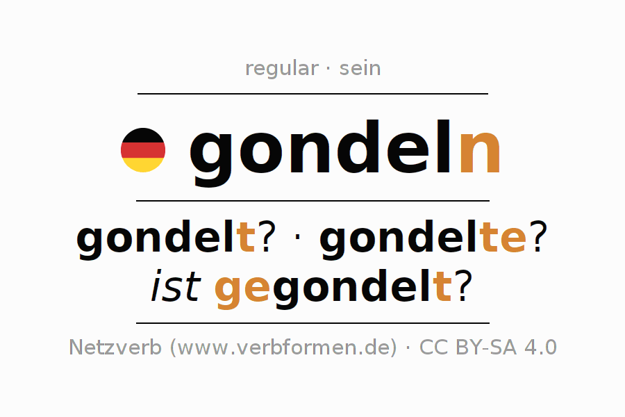 The conjugation of gondeln in Infinitive Present Perfect base form Active is gondeln, zu gondeln.The conjugation corresponds to certain grammatical rules. Likewise the requirements for the conjugation of the simple verb forms of gondeln in Infinitive. Comments ☆