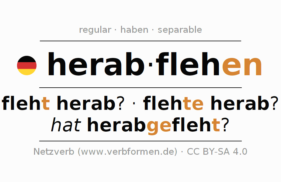 The verb herabflehen fully conjugated in all persons and numbers in the Infinitive Present Perfect